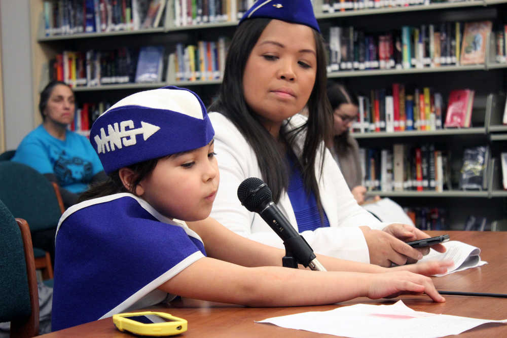 Eight-year-old Kaija Guthrie is a student of the Tlingit Culture, Language & Literacy program. She testified with her mother, Melanie Rodriguez, at Tuesday night's Juneau School Board meeting.