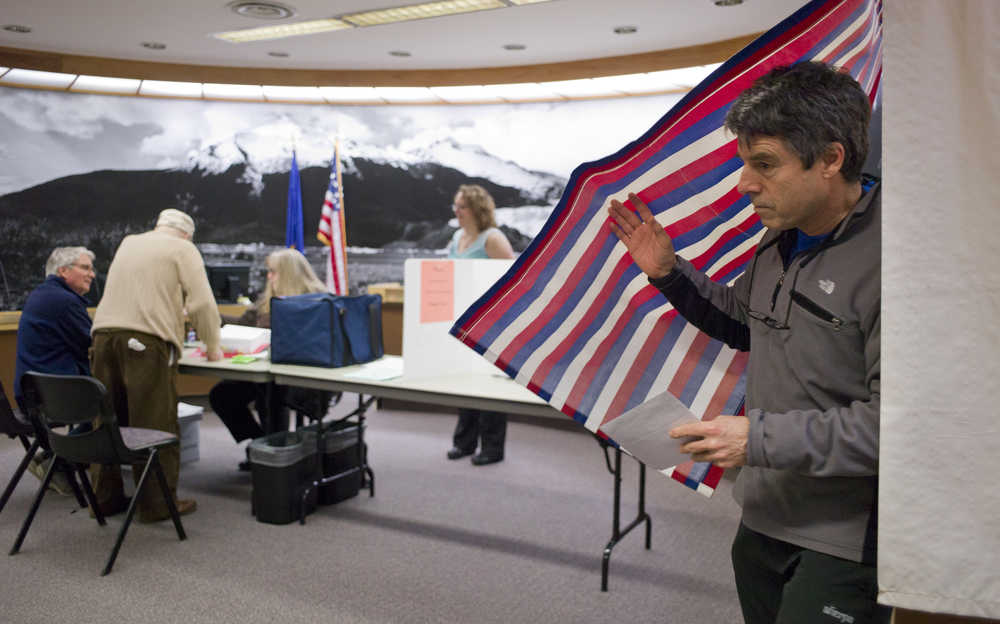 Fred Hiltner exits a voting booth in the Assembly chambers after taking advantage of early voting on Friday. Monday is the last day of early voting at both the Assembly chambers and the Mendenhall Mall. Election day is Tuesday.