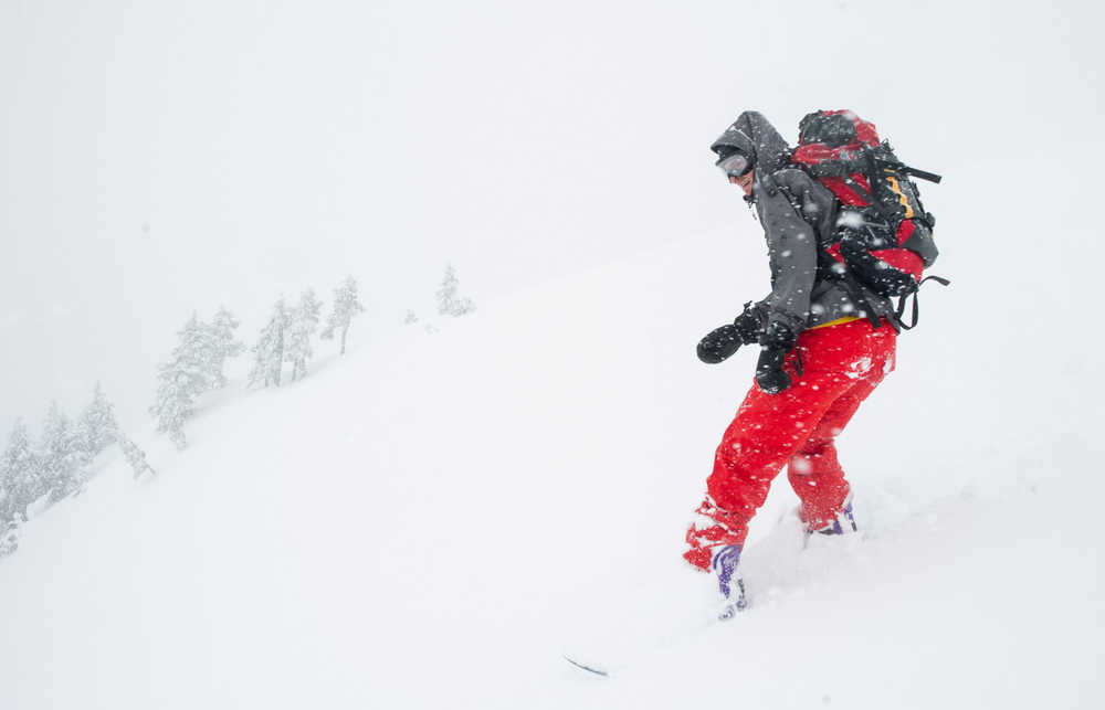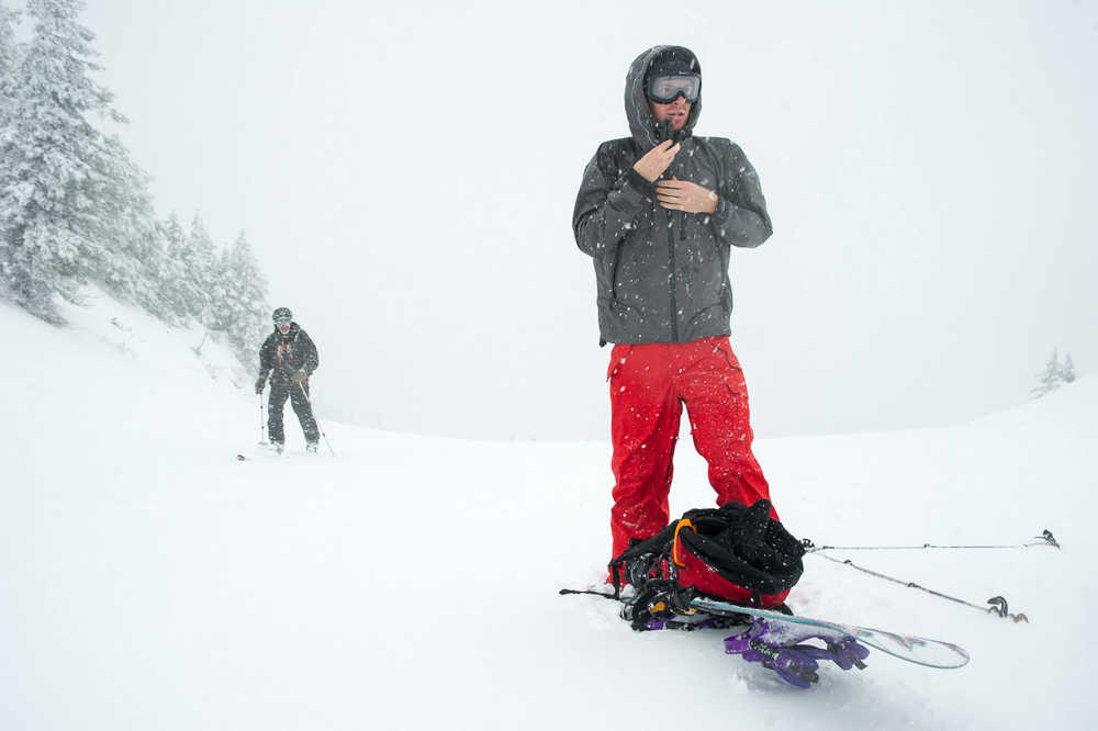 Sammy Becker, right, and Mo Michels head up to Pittman’s Ridge in wintery conditions to take advantage of the fresh snow after skinning up the mountain at Eaglecrest on Wednesday. The Porcupine Chairlift is scheduled to be open this weekend. The ski area is to suspend operations starting Monday, March 21, unless snow conditions improve.