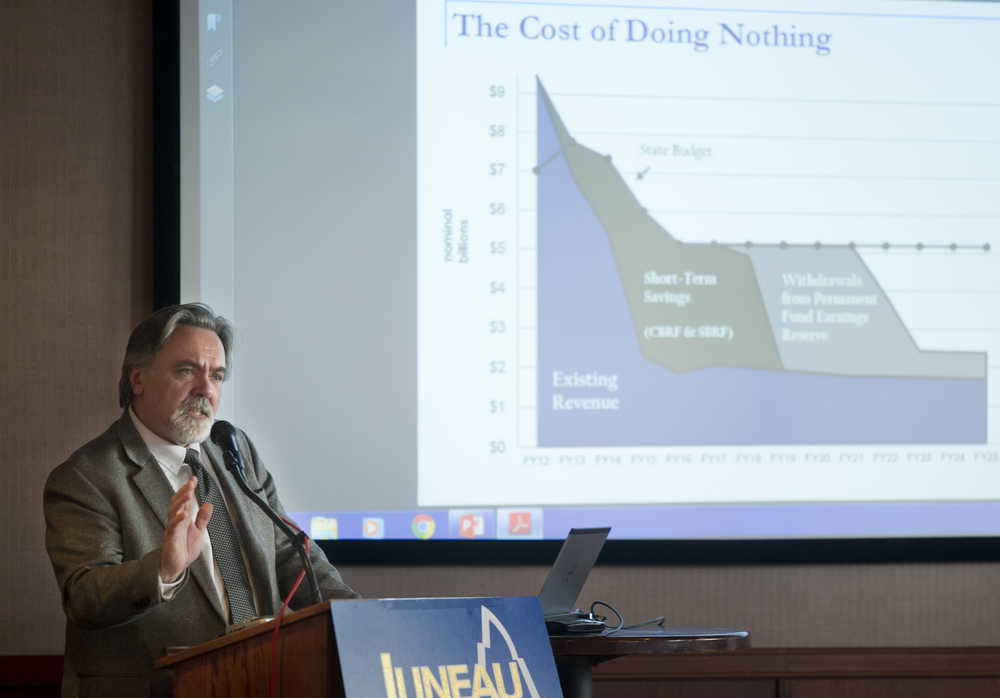 Randy Hoffbeck, Commissioner for the Department of Revenue, speaks the Juneau Chamber of Commerce about Gov. Bill Walker's fiscal plan at the Hangar Ballroom on Thursday.