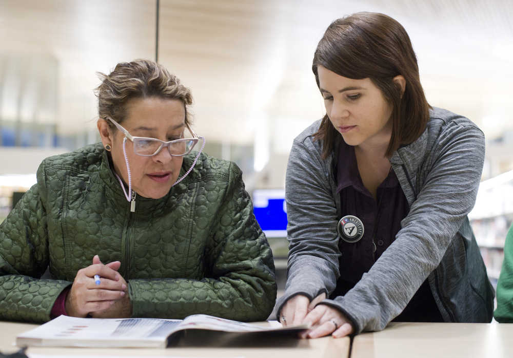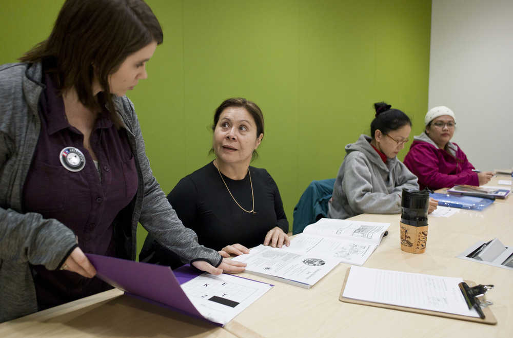 Delia Canales, left, originally from Mexico, receives instruction from Felicite Toney during an English as a Second Language class at the Mendenhall Valley Public Library last month. The Learning Connection provides ESL and immigration courses for free.