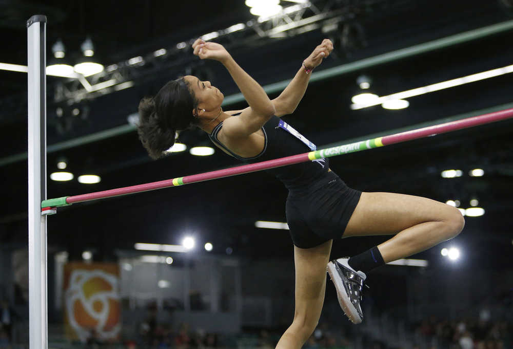 In this March 12 photo, Vashti Cunningham clears a height in the women's high jump at the U.S. indoor track and field championships in Portland, Oregon. Cunningham, 18, is competing in the high jump at the U.S. indoor track and field championships this week in Portland.