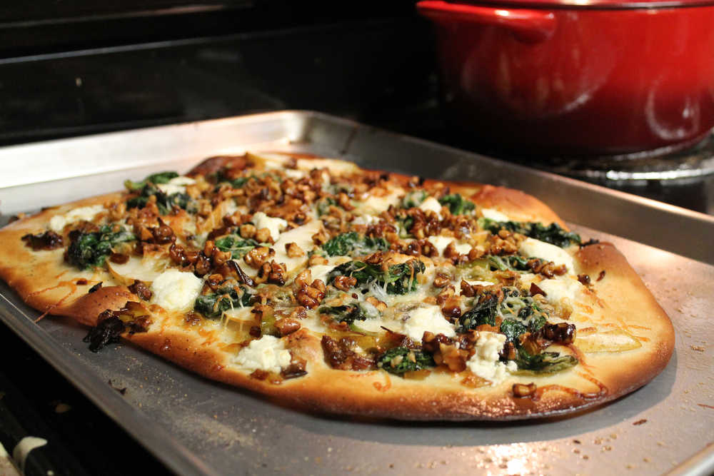Handing over the baby, she commenced to rolling the pizza dough into a crust and then we added toppings. I made caramelized leeks and candied walnuts to go on the pizza. We added a pear, sautéed spinach with garlic, and the goat cheese. Just before serving we added a light drizzle of honey. The combination of sweet, savory and salty made for an incredible mixture of flavors.