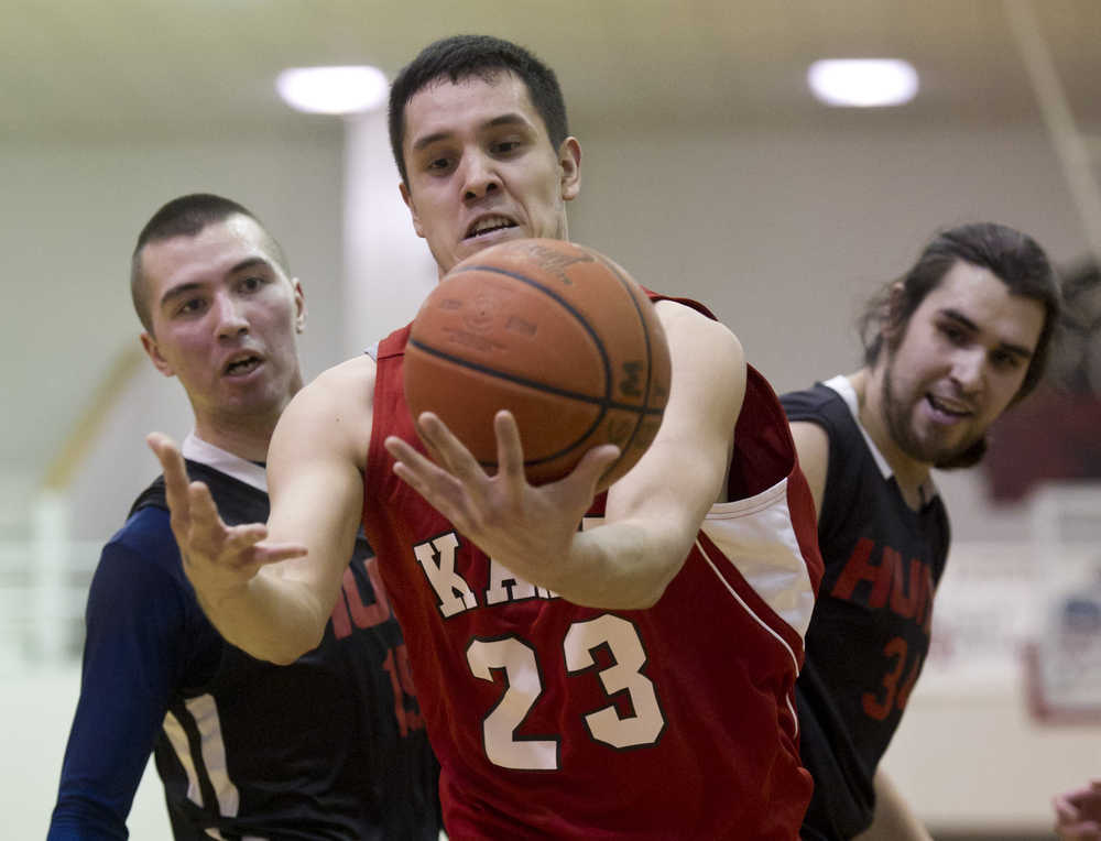 Kake’s Dean Cavanaugh grabs a loose ball in front of Hoonah’s Brian Koenig, left, and Brian Mills during their B bracket game in the 2016 Gold Medal Basketball Tournament on Tuesday. Kake won the game 91-53.