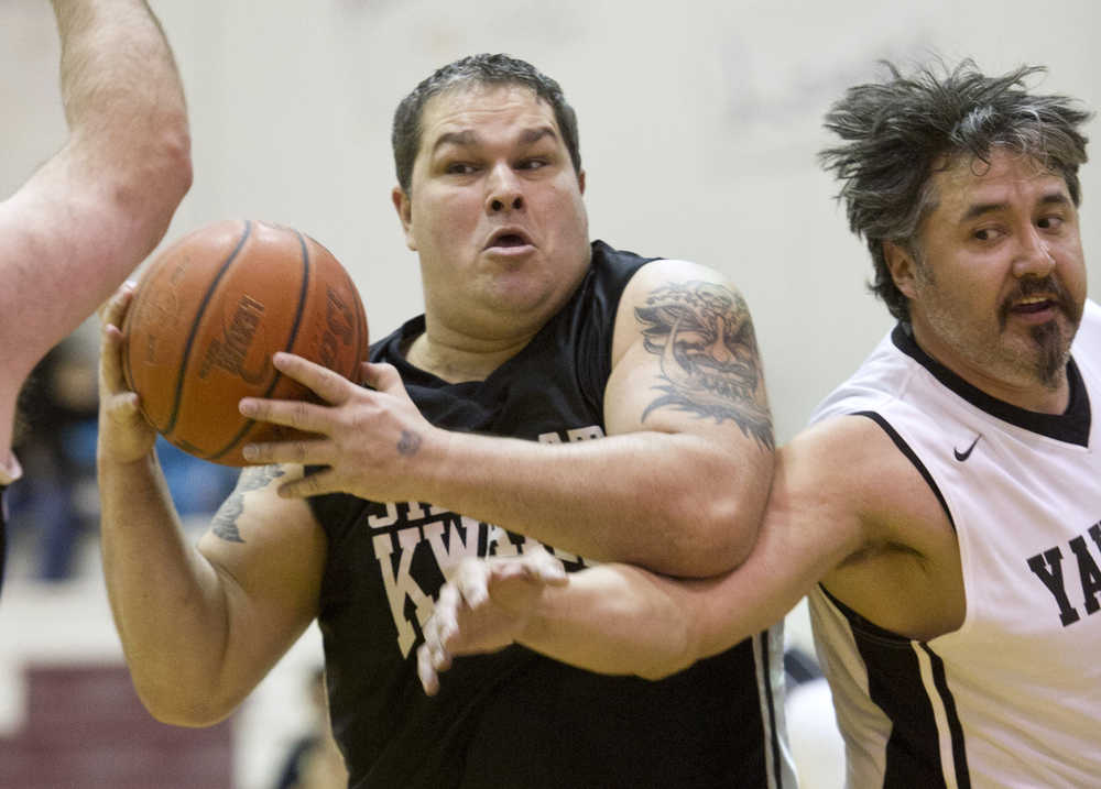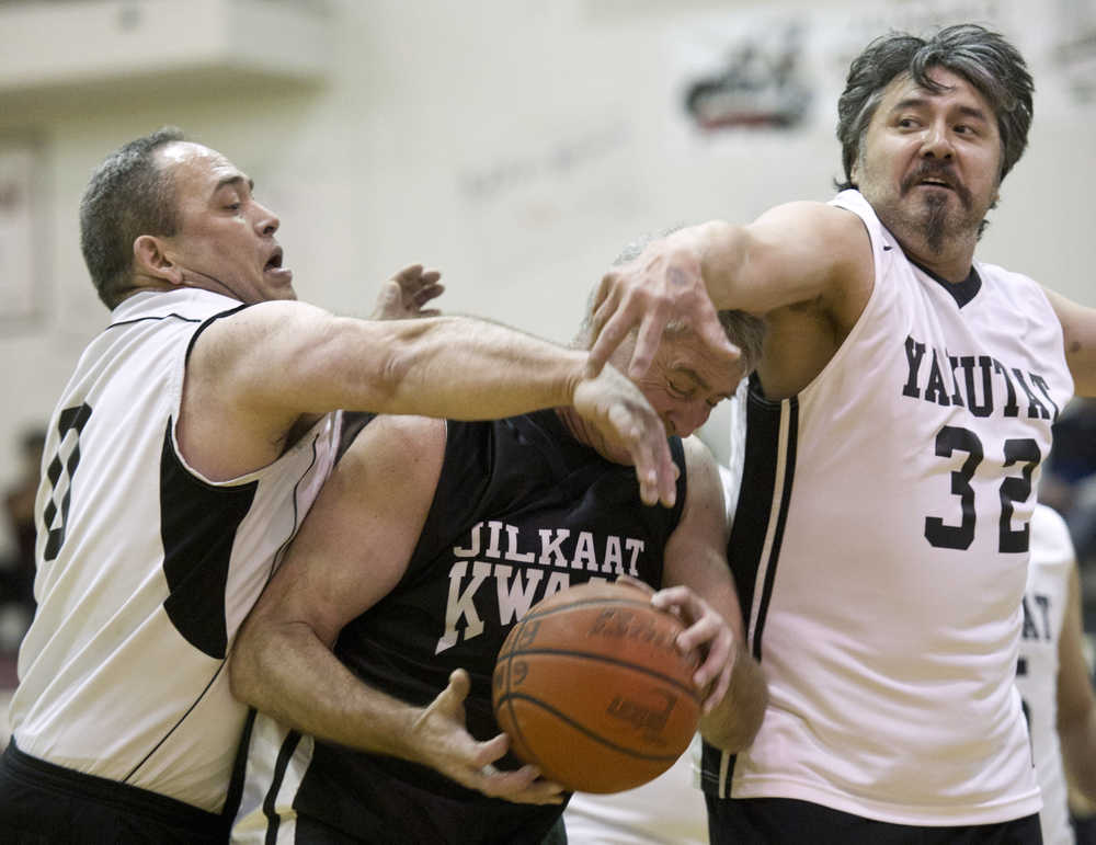 Klukwan's Steve Brandner, center, is sandwiched between Yakutat's Bob Rockwood, left, and Gary Klushkan during their Masters bracket game in the 2016 Juneau Lions Club 70th Gold Medal Basketball Tournament at Juneau-Douglas High School on Wednesday.