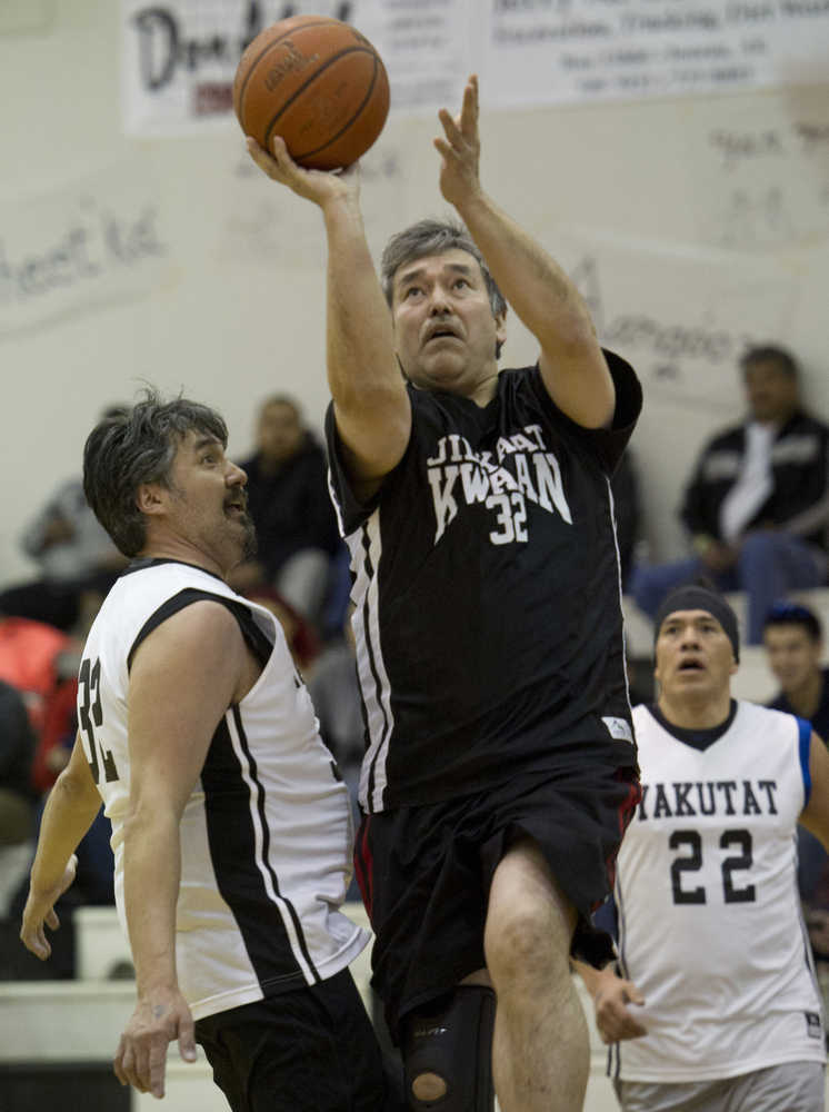 Klukwan's Dan Hotch drives to the basket between Yakutat's Gary Klushkan, left, and Sam Demmert during their Masters bracket game in the 2016 Juneau Lions Club 70th Gold Medal Basketball Tournament at Juneau-Douglas High School on Wednesday.