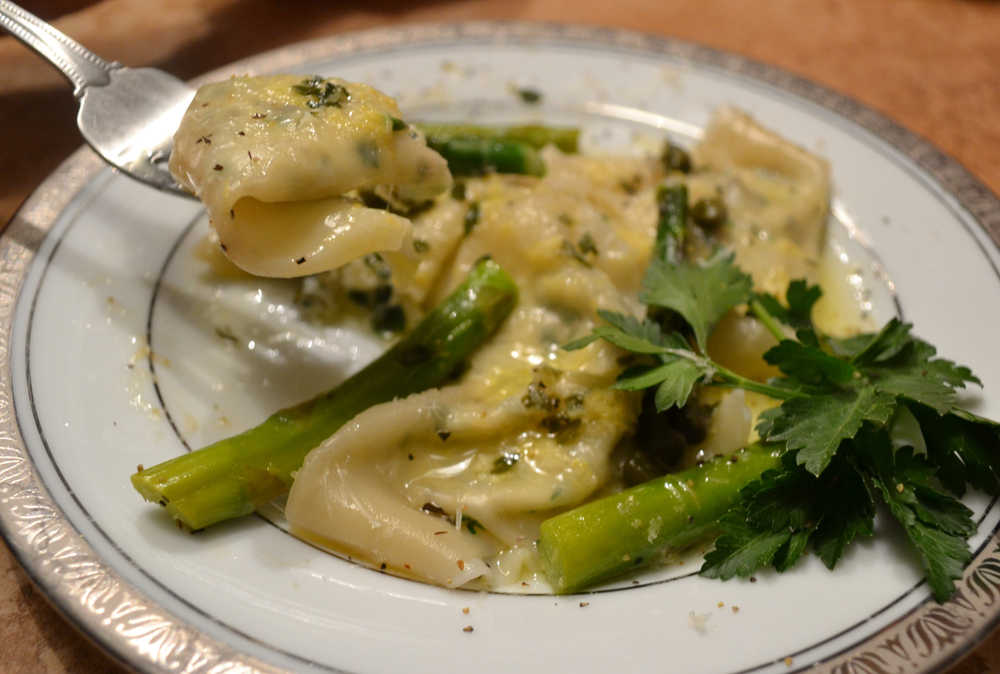This week I present a recipe that is fun to make and can involve the kiddos, too: herb and cheese raviolis with lemon butter sauce. I love using little kitchen cheats to make something simple seem fancy. The wontons were a perfect solution.
