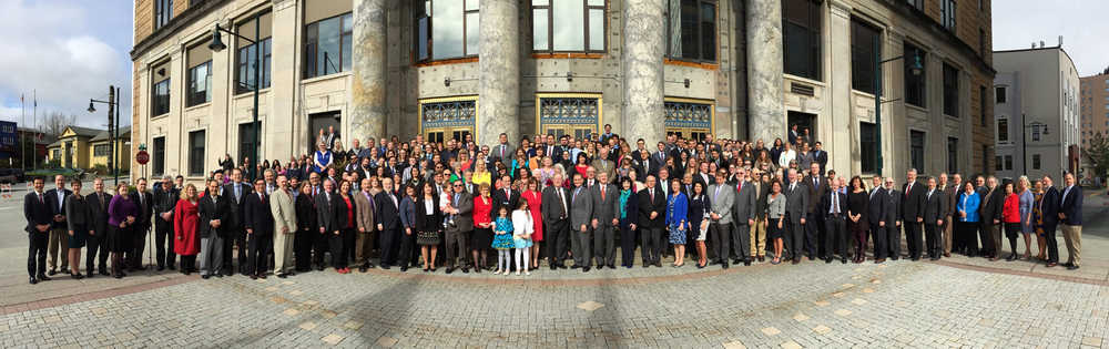 Alaska state lawmakers and their staffs line up for the annual legislative group picture in front of the Capitol Wednesday.