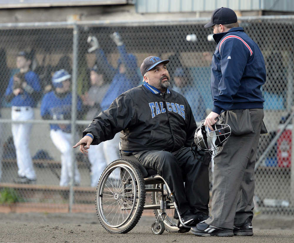 Thunder Mountain coach Joe Tompkins talks to an umpire Friday, April 8, 2016, during the Falcons' 5-8 loss to Ketchikan High School at Norman Walker Field.