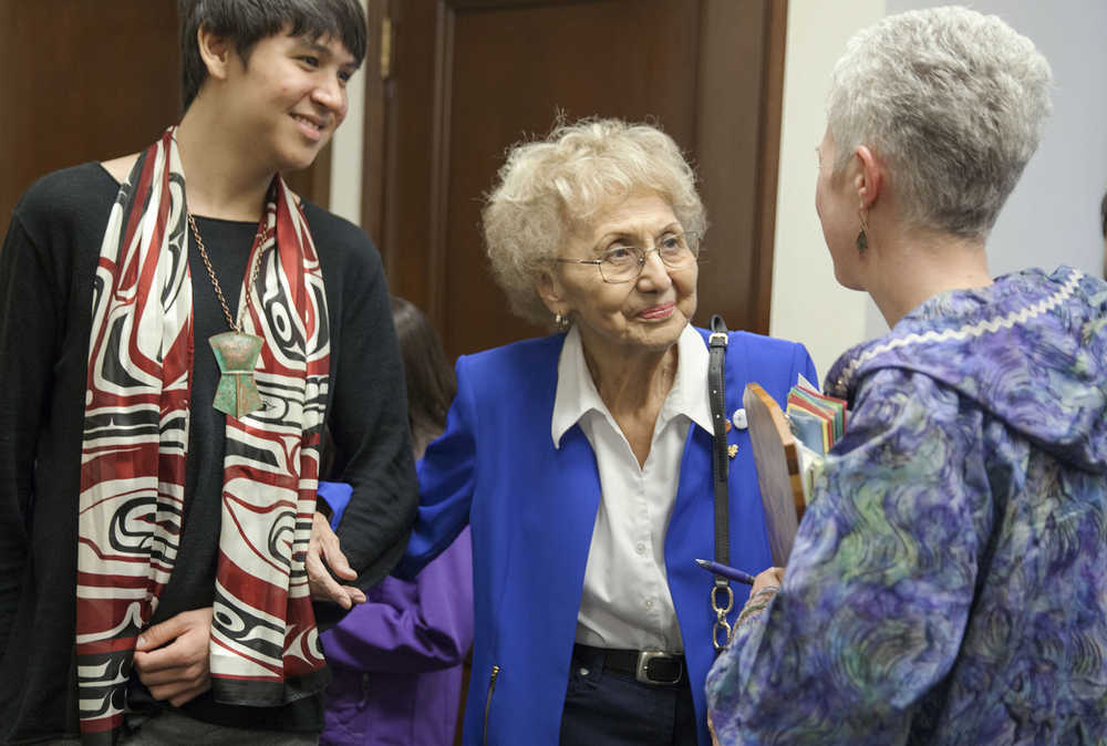 In this Friday, March 25, 2016 photo, Legislative aid David Russell-Jensen, of Juneau, escorts Tlingit elder Selina Everson out of a floor session after she gave the traditional invocation, in Juneau, Alaska. Everson, a former Capitol employee, said she is happy to see legislators carrying on a "Kuspuk Friday" tradition where they wear the traditional Alaska Native garment at work for the day. While Alaska Native lawmakers started the tradition, it has since crossed racial and ethnic boundaries to be embraced by legislators who have found diverse ways to incorporate their own ideas into the garment. (AP Photo/Rashah McChesney)