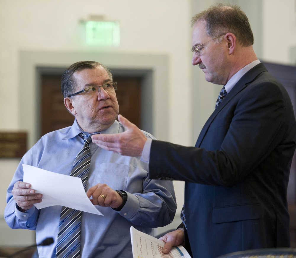 Sen. Lyman Hoffman, D-Bethel, left, asks a question of Legislative Finance Director David Teal after the introduction of a new Permanent Fund Dividend bill in the Senate Finance Committee Tuesday that aims to reduce Alaska's budget deficit.