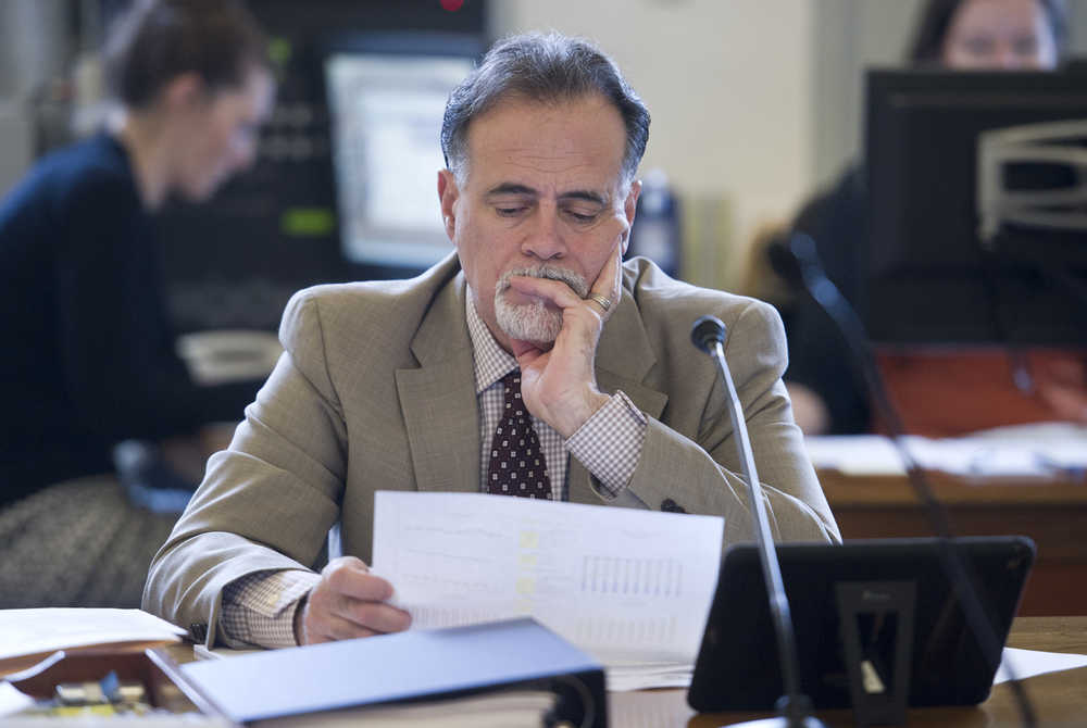 Sen. Peter Micciche, R-Soldotna, studies a chart during the introduction of a new Permanent Fund Dividend bill in the Senate Finance Committee Tuesday that aims to reduce Alaska's budget deficit.