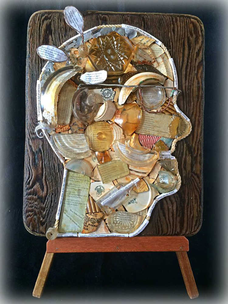 And, of course, the beach inspires me. Beachcombing is an important part of my writing and art process. I often get my ideas while picking up a specific glass shard from the beach. Each piece has a story to tell. I’m a storyteller. My modes of storytelling are writing and sculpting mixed-media pieces.
