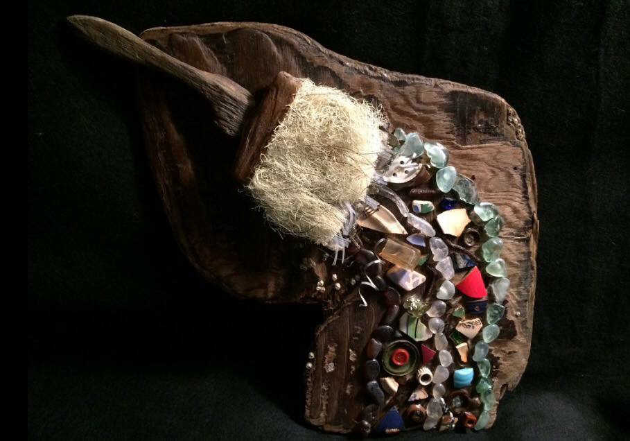 I create art from antique and vintage pottery shards, glass, seaplanks and seametals that I scavenge from Wrangell’s old garbage dump beach. Sometimes my sculptures are loosely planned, or sketched out, and other times I go to my work table with a “blank slate,” which is usually a seaplank I’ve salvaged from a boat graveyard.