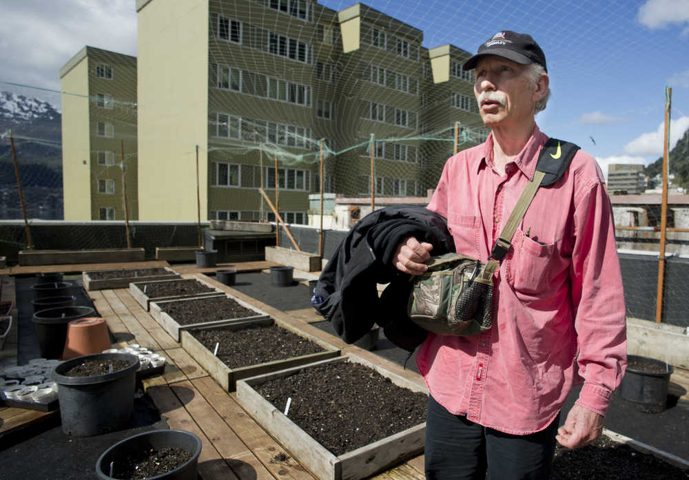 Mike Ricker looks out over the rooftop garden he helped build at the Glory Hole on Tuesday.