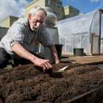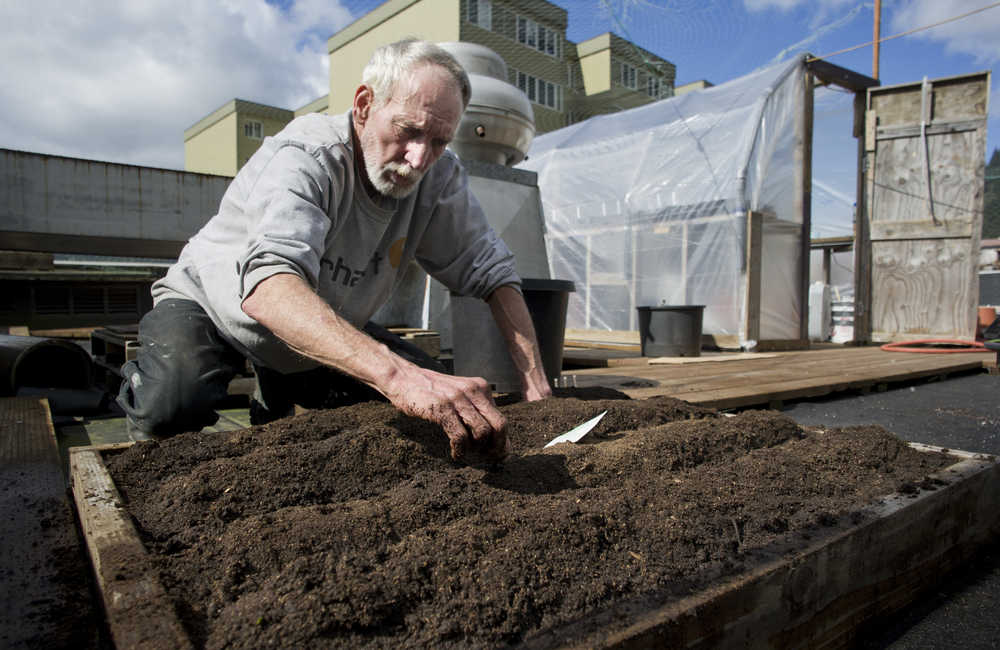 Chuck Raab plants radishes in the Glory Hole's rooftop garden on Tuesday. Raab said he has been staying at the shelter since August.