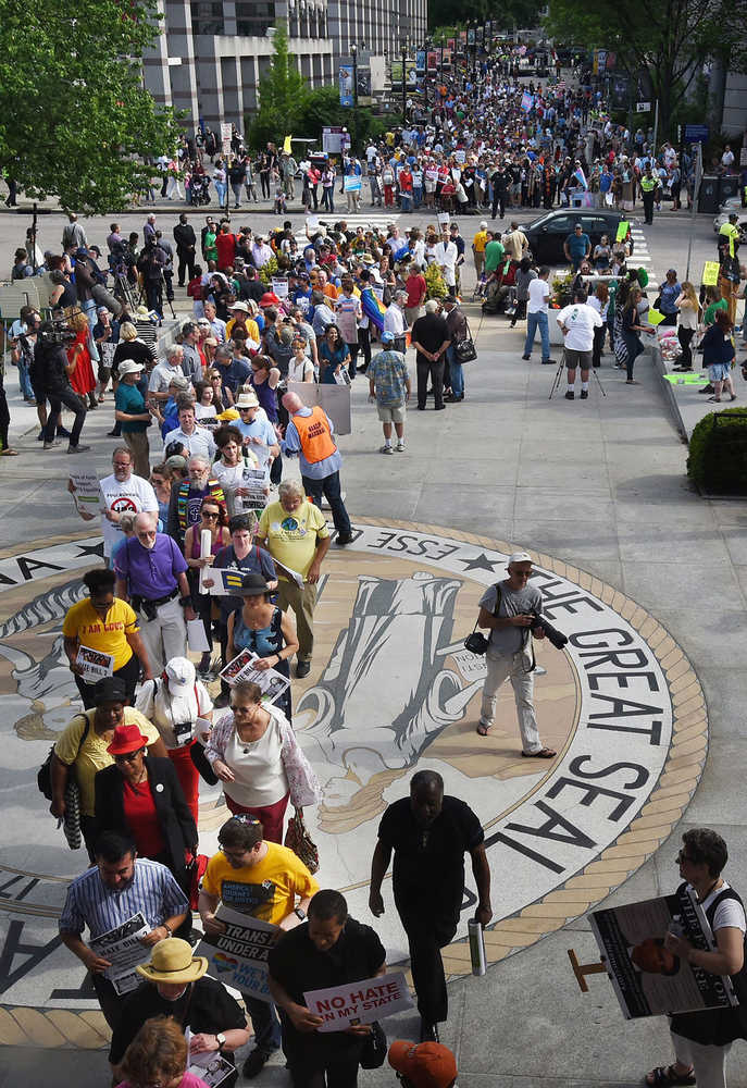 Protesters head into the Legislative building for a sit-in Monday against House Bill 2 in Raleigh, North Carolina.