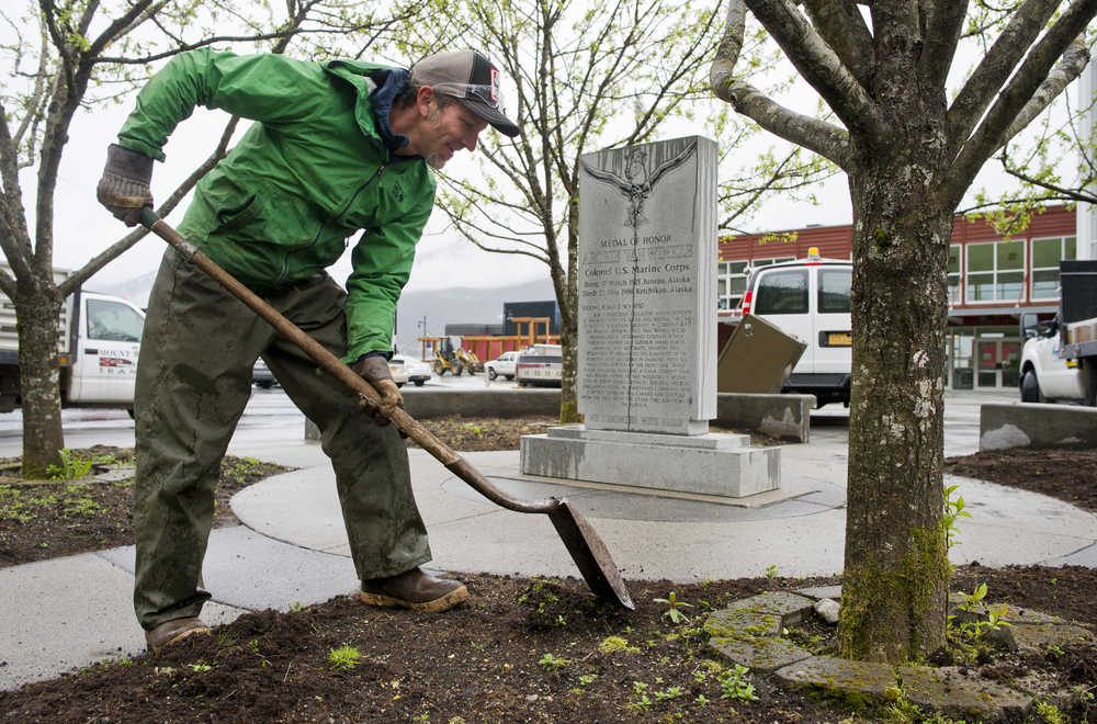 Dale McFarlin, of the city landscaping division, weeds the garden next to the Archie Van Winkle memorial on South Franklin Street on Tuesday.