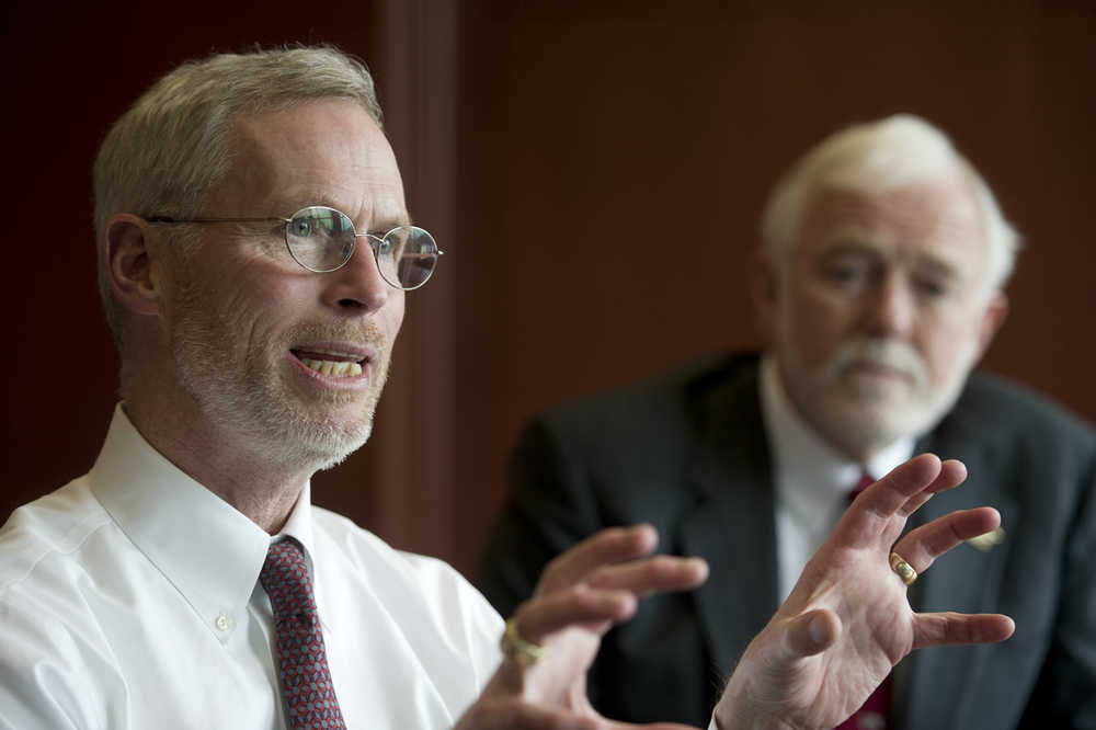 University of Alaska President Jim Johnsen, left, speaks during an interview at the Juneau Empire on Thursday. Attending the interview with Johnsen is University of Alaska Southeast Chancellor Rick Caulfield.