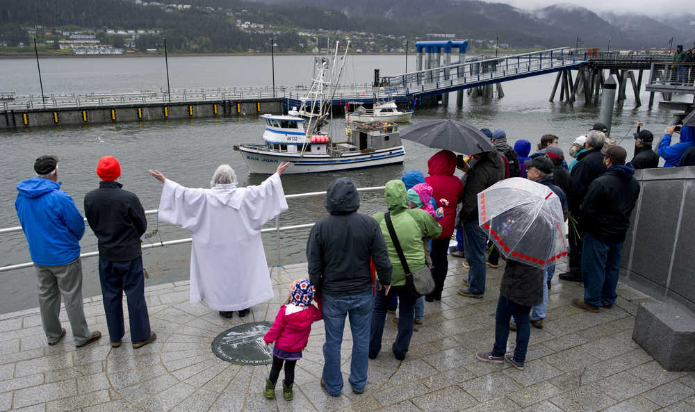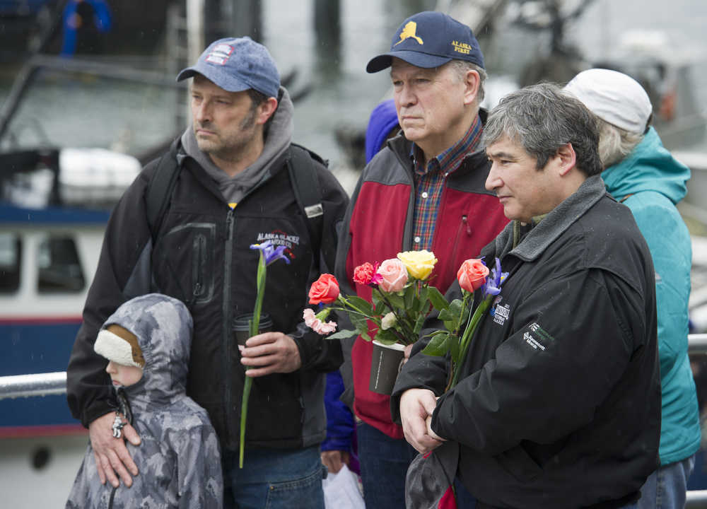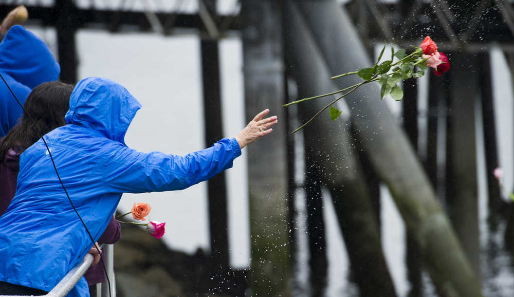 Girl Scout Lauren Stichert, 9, of Troop 4018 hands out flowers during the Blessing of the Fleet and Dedication of Names at the Alaska Commercial Fishermen’s Memorial in Juneau on Saturday, May 7, 2016.