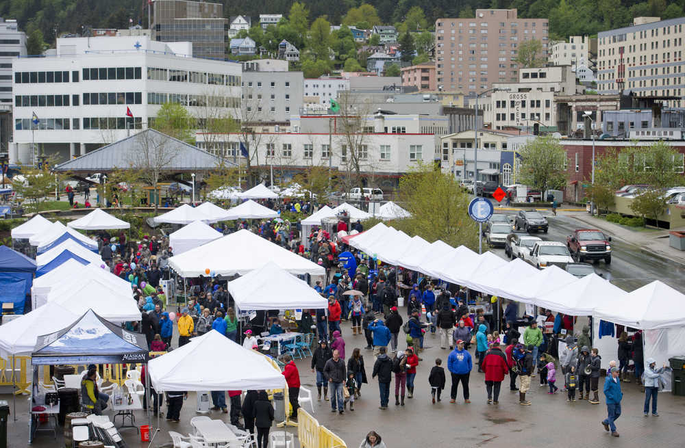 Irat De La Mora acknowledges the crowd after showing his talent for slicing up coho salmon at the Juneau Maritime Festival at Marine Park in Juneau on Saturday, May 7, 2016.