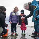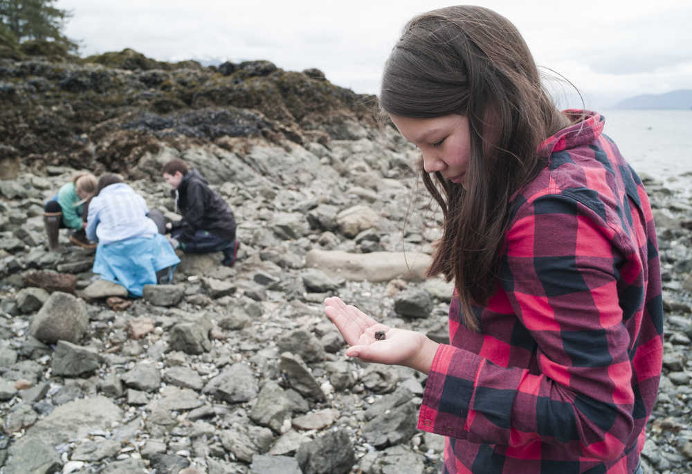 Elin Antaya, a sixth grader at Dzantik’i Heeni Middle School, examines a small crab while investigating the intertidal zone at Point Louisa on Monday. Monday’s minus four-foot low tide had many Juneau School District students scouring local beaches for life.