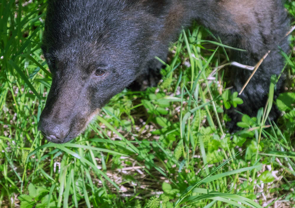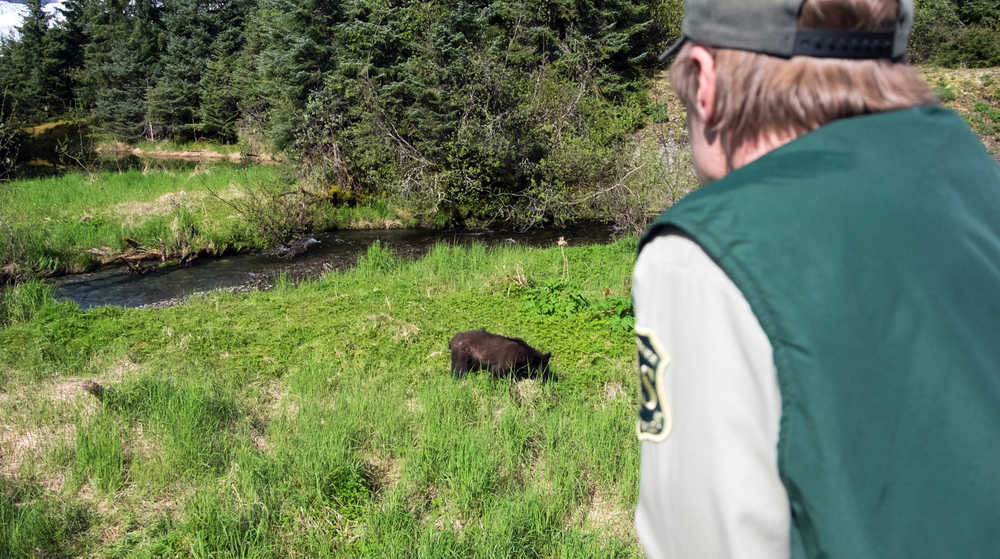 U.S. Forest Service park ranger Donald Macdovgall 59, stands on the Steep Creek Meadow platform looking down at a adolescent male bear, estimiated to be about 2 years old old, on Tuesday afternoon. Macdovgall said bears are going to be a lot more common now that its getting warmer and plants are coming out.