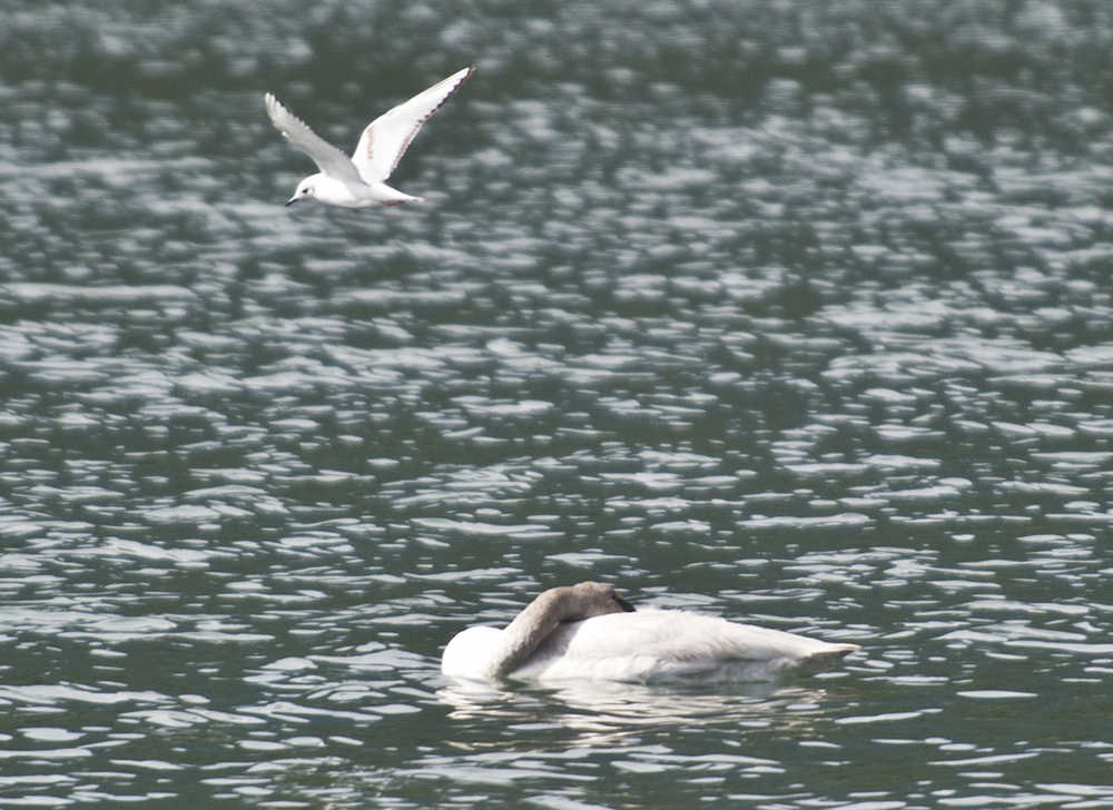 A kittiwake flies by a sleeping trumpeter swan in Gastineau Channel on Wednesday.
