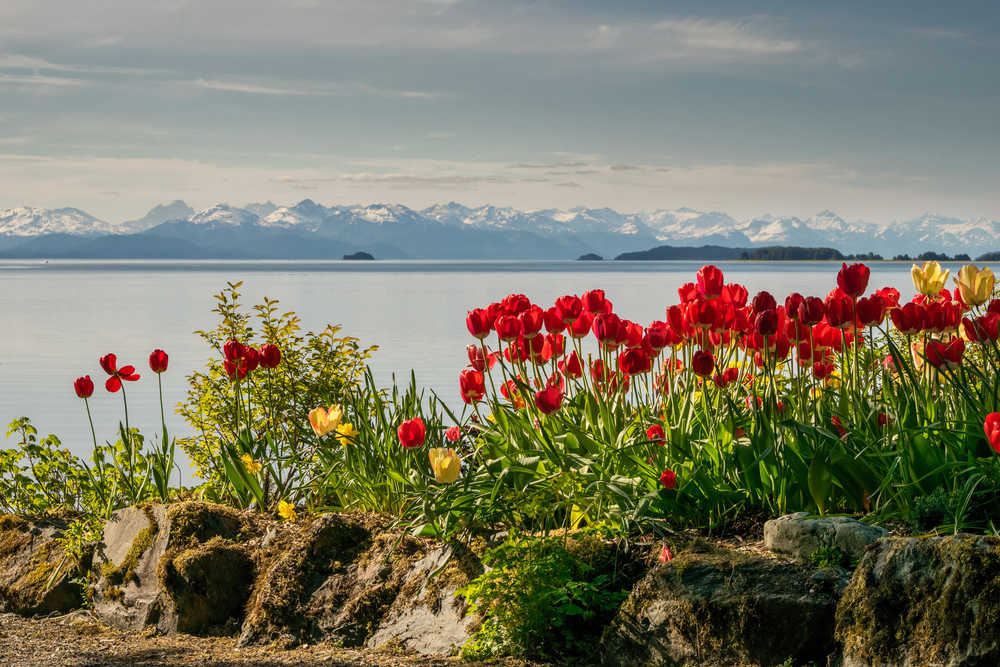 The sun shines on tulips at the Shrine of St. Therese on Saturday afternoon.