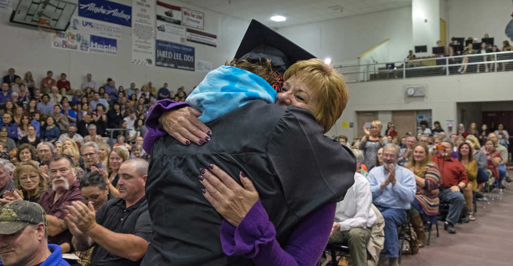Hunter Pegues hugs his mother, Kelli Manchester, after his speech during the graduation ceremony Sunday at Juneau-Douglas High School.