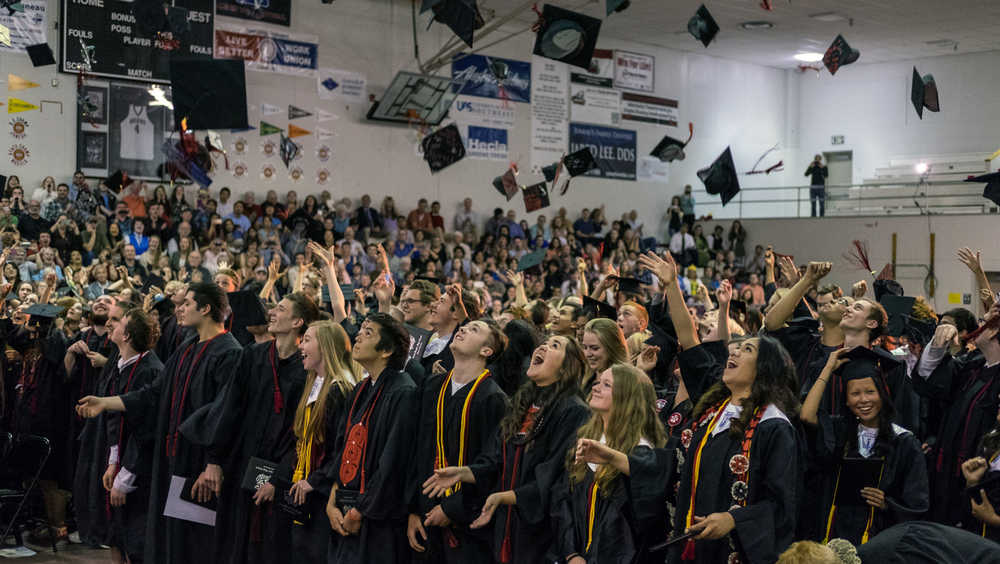 The Class of 2016 toss their hats into the air at the conclusion of the graduation ceremony Sunday at Juneau-Douglas High School.
