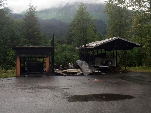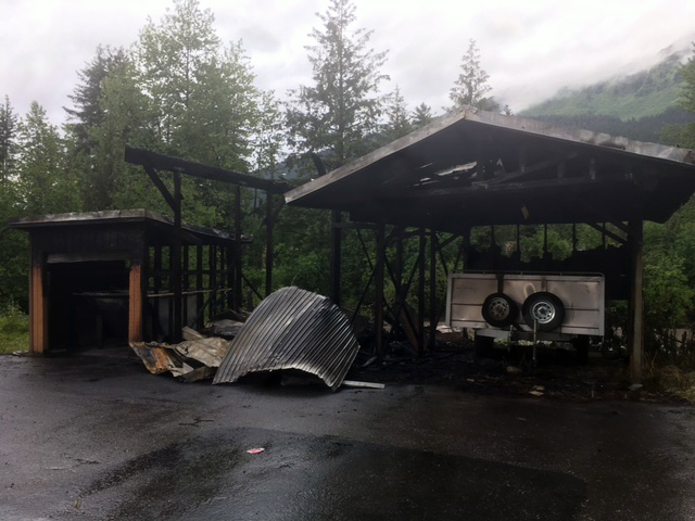 CCFR Fire Marshal Dan Jager said in a press release Monday that the early morning blaze in the 5700 block of Glacier Highway created columns of smoke visible from two miles away. The carport area contained a dumpster, cab-over-camper and a flatbed tow trailer, all destroyed in the fire. The estimated cost of the damage is $45,000.