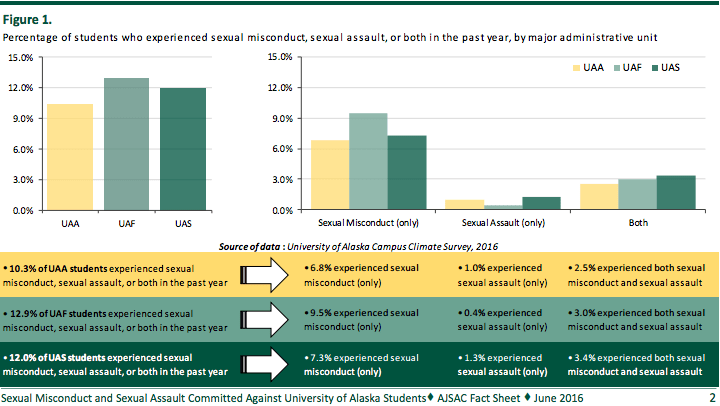 Of the students statewide who experienced sexual misconduct, sexual assault or both, nearly a third experienced at least one attempted or completed sexual assault. Just looking at UAS, about 110 students were victims of at least one attempted or completed sexual assault.