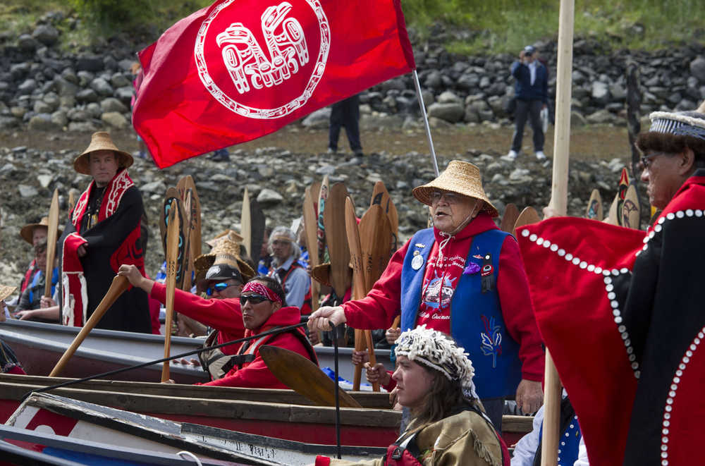 Among the roughly 100 people who arrived in canoes Wednesday were a few celebrity paddlers. Gov. Bill Walker and Lt. Gov. Byron Mallot joined the canoe convoy a couple miles down channel of the harbor.