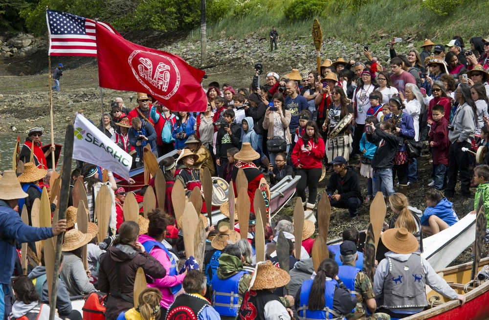 The thump of rawhide drums and the voices — chanting and singing — of those beating them carried over the embankment separating the Douglas Harbor from Sandy Beach, where hundreds of onlookers watched as 10 canoes made their way up the Gastineau Channel.