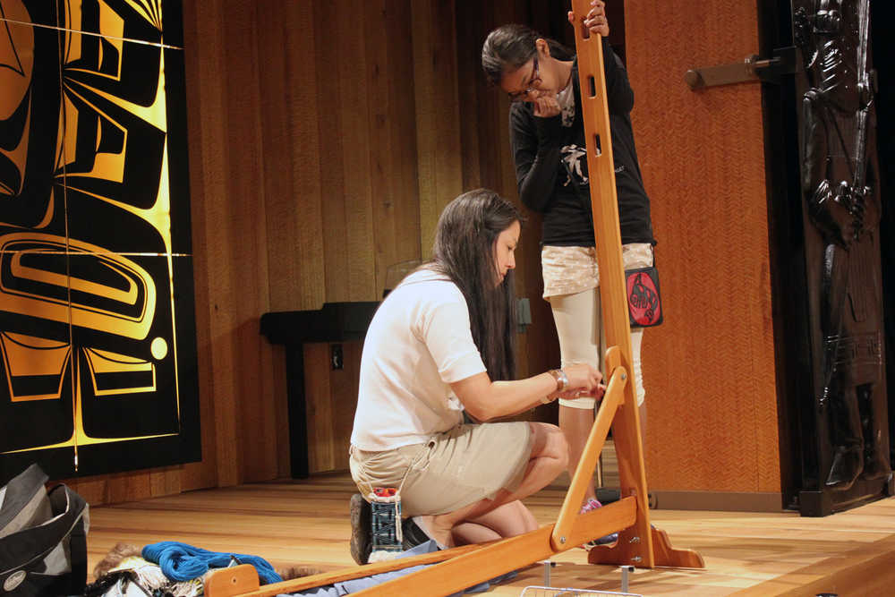Shgen George and daughter Gabby Kay set up a portable weaving loom during the Ravenstail and Chilkat Weavers Symposium at the Walter Soboleff Building's clan house Wednesday.