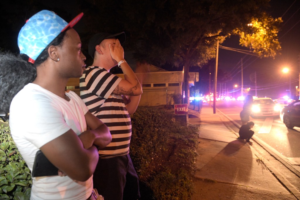 Jermaine Towns, left, and Brandon Shuford wait down the street from a multiple shooting at a nightclub in Orlando, Fla., Sunday morning. Towns said his brother was in the club at the time. A gunman opened fire at a nightclub in central Florida, and multiple people have been wounded, police said Sunday.