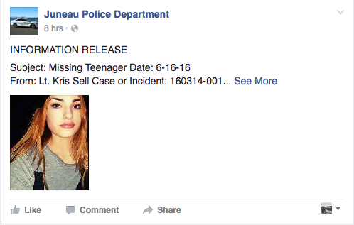 The Juneau Police Department is asking the public for help finding a teenage runaway whose recent activity, or lack thereof, has raised a red flag.