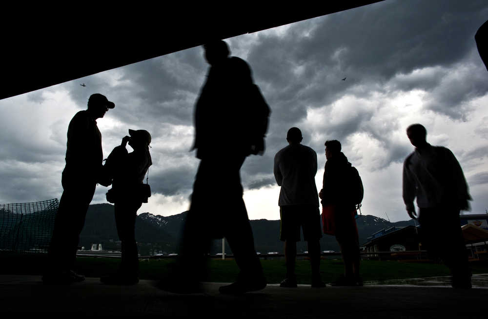 Tourists take shelter under the Marine Park canopy as a rare thunderstorm passes over Juneau in June 2013.