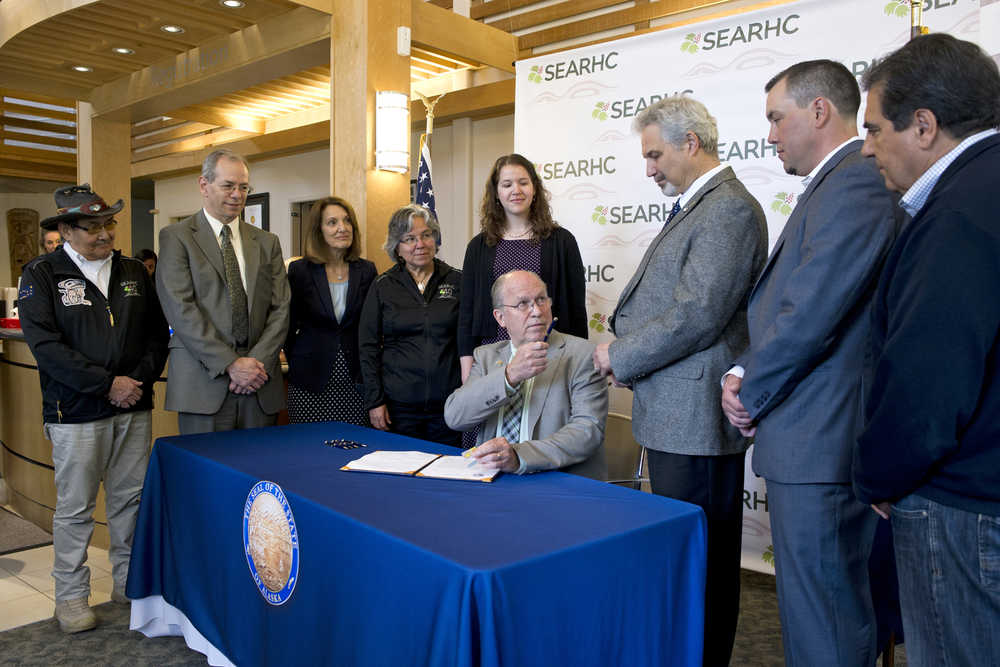 Gov. Bill Walker hands Sen. Pete Kelly, R-Fairbanks, the pen he used to sign Senate Bill 74 into law at the SouthEast Alaska Regional Health Consortium’s Ethel Lund Medical Center on Tuesday. The bill is expected to save the state more than $365 million in the first six years in the state’s Medicaid program. Also appearing from left: John Morris, SEARHC boardmember, Jon Sherwood, Deputy Commissioner of the Department of Health and Social Services, Sana Efird, Assistant Commissioner of the Department of Health and Social Services, Kimberley Strong, Chairman of the Board for SEARHC, Heather Shadduck, staff to Sen.Pete Kelly, Sen. Kelly, Charles Clement, President/CEO of SEARHC, and Carlton Smith, trustee of the Mental Health Trust.