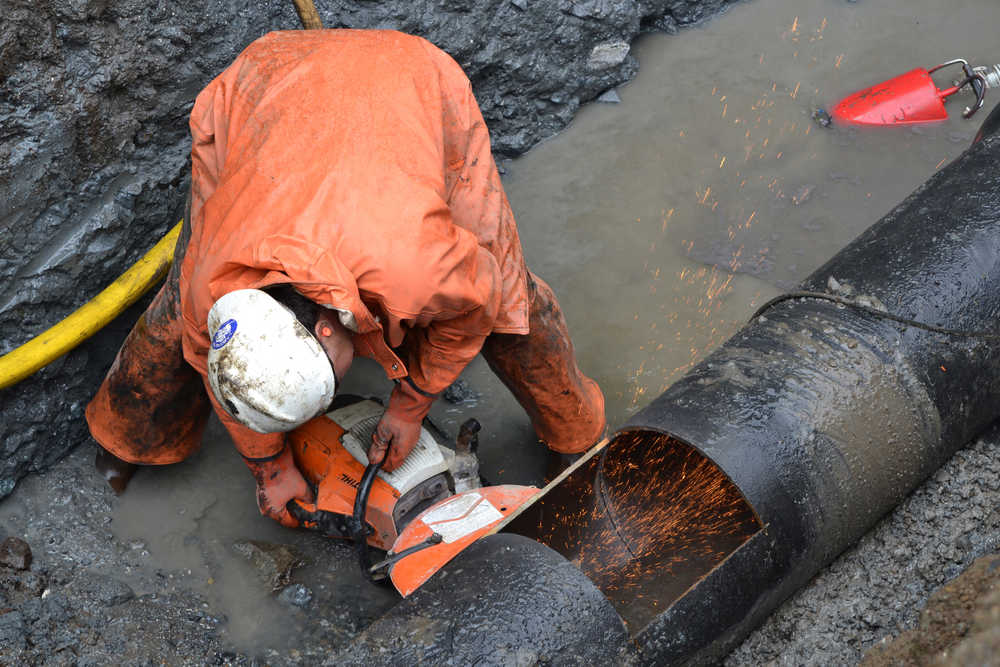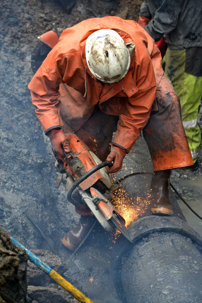 Ed Beam, a laborer with Admiralty Construction Inc., cuts out a corroded section of water main off of Glacier Highway near Point Lena Loop Road.