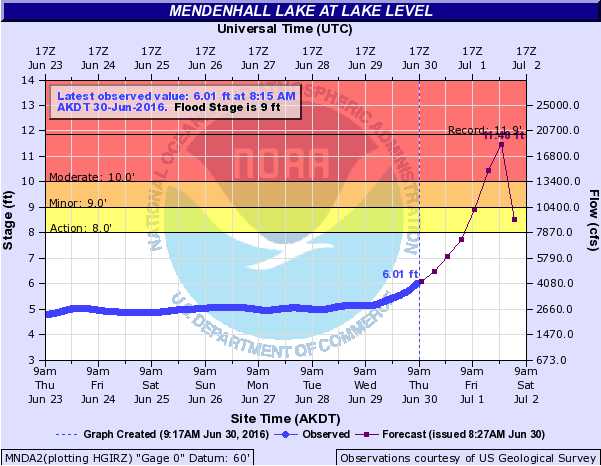 The water level of Mendenhall Lake is at about 6 feet currently, and the hydrograph indicates that the water level will crest sometime between Friday and Saturday.