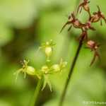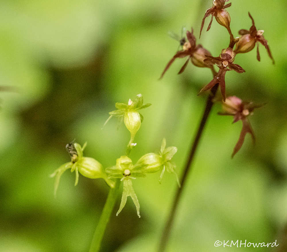 At the understory level, I saw a new kind of horsetail, which had branched branches, giving it a lacy look. A good find was a wide expanse of blooming twayblade orchids (Listera cordata) composed of both reddish and green individuals. Some readers may recall that twayblades were studied by Darwin, whose detailed observations of these tiny flowers revealed that when a small insect touches an inner part of the flower, the flowers blasts out a sticky mass of pollen onto the unsuspecting bug’s eyes or head.