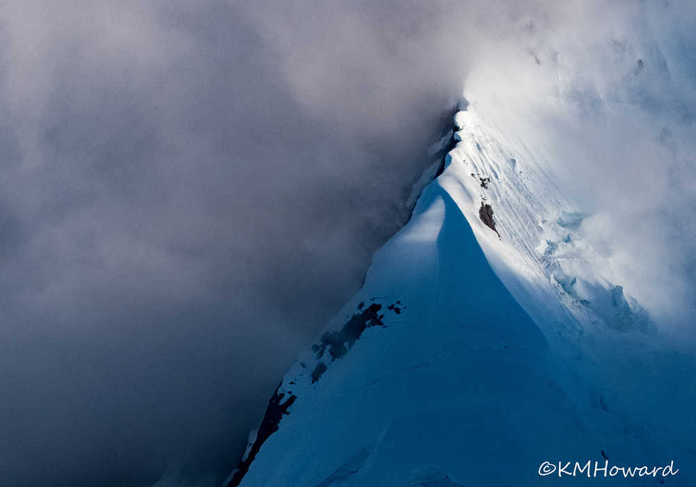 Then, dead ahead is the boulder-strewn toe of the glacier, backed by a view of the spectacular Sawtooth Range. Angular 7,000-foot peaks and knife-edge ridges poke out of the snow and ice. Rugged and beautiful on a bright, sunny day, the Range is arguably even more visually arresting when clouds boil up behind the peaks and tumble over, swirling and dissipating as they descend. The snowy slopes are decorated by the curving paths of falling snowballs, small debris fans and some slab-breaks that may soon give way.