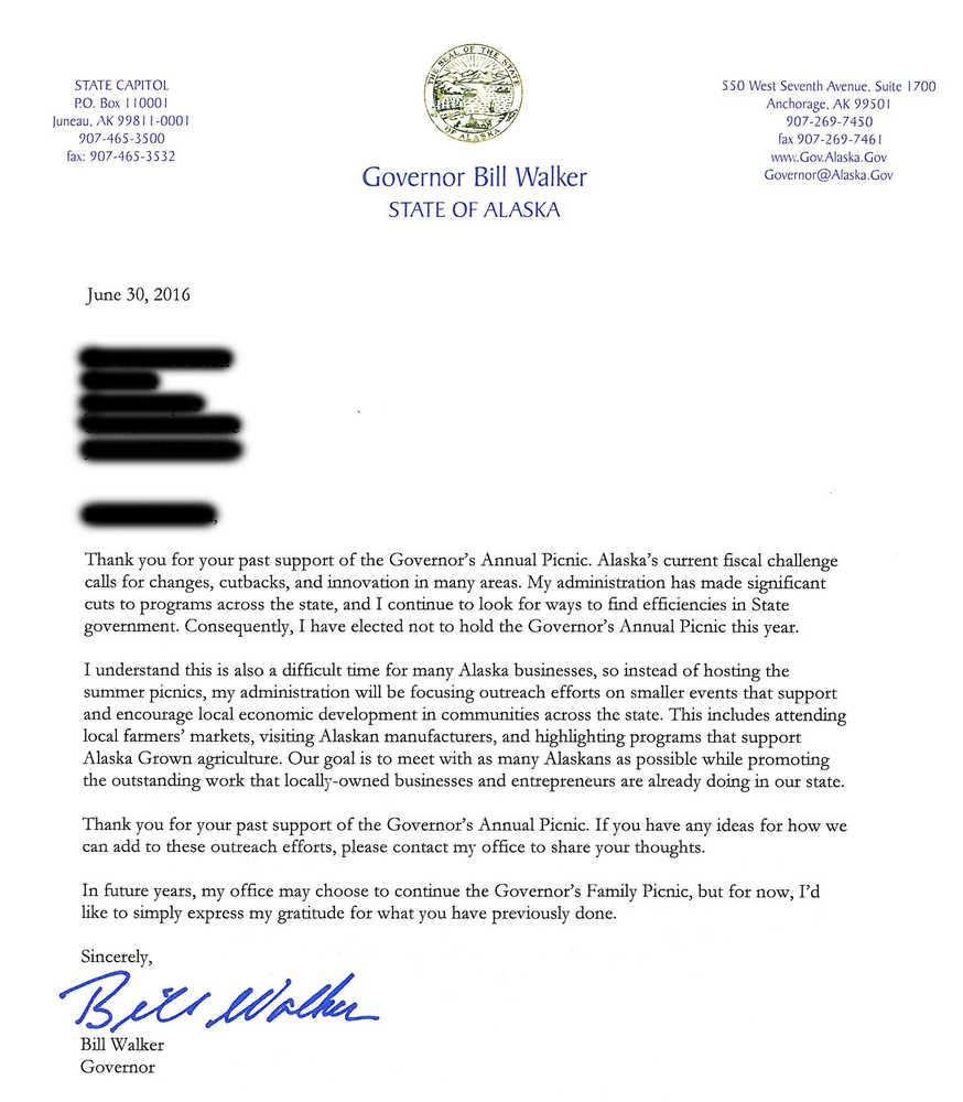In a letter dated June 30 to supporters of the annual Governor’s Family Picnic, which are held in Alaska’s largest cities including Juneau, Walker wrote he is continuing to look for “efficiencies” in state spending, and that means no picnics in 2016.