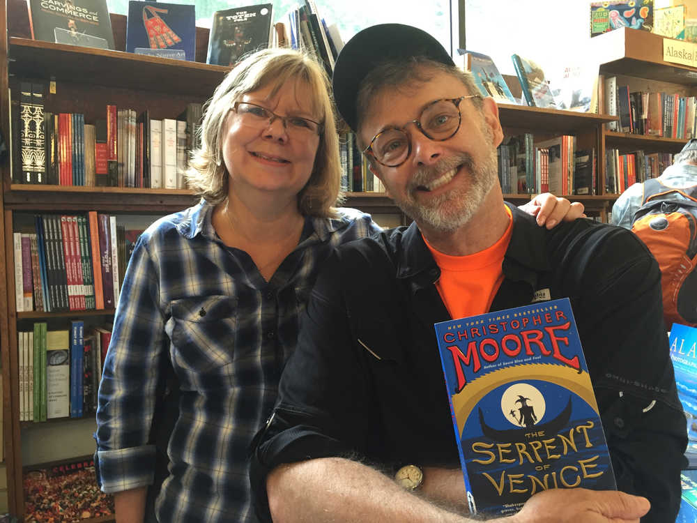 Internationally best-selling author Christopher Moore and Hearthside Books owner Brenda Weaver pose with Moore’s 2014 book “The Serpent of Venice.” Moore is in Juneau to visit friend, reknowned whale photographer and Juneau resident Flip Nicklin, whom Moore got to know while researching his 2003 book “Fluke, or, I Know Why the Winged Whale Sings.” Mary Catharine Martin | Capital City Weekly