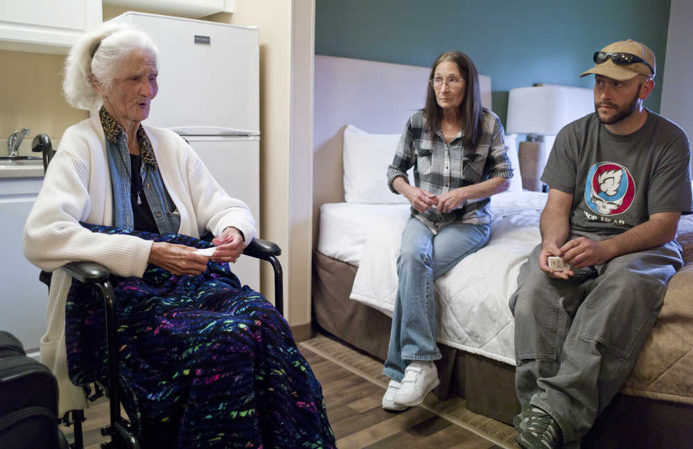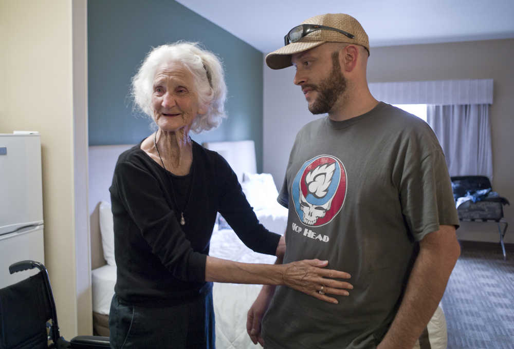 Earlene "Memaw" Branson, 83, mother to Alaskan Bush People star Ami Brown, gives thanks to her great nephew, Chuck Gilbert, for helping on her journey from Texas to Alaska in hopes of reuniting with her daughter this week. They were interviewed at Extended Stay America in Juneau after returning from Hoonah on Wednesday.