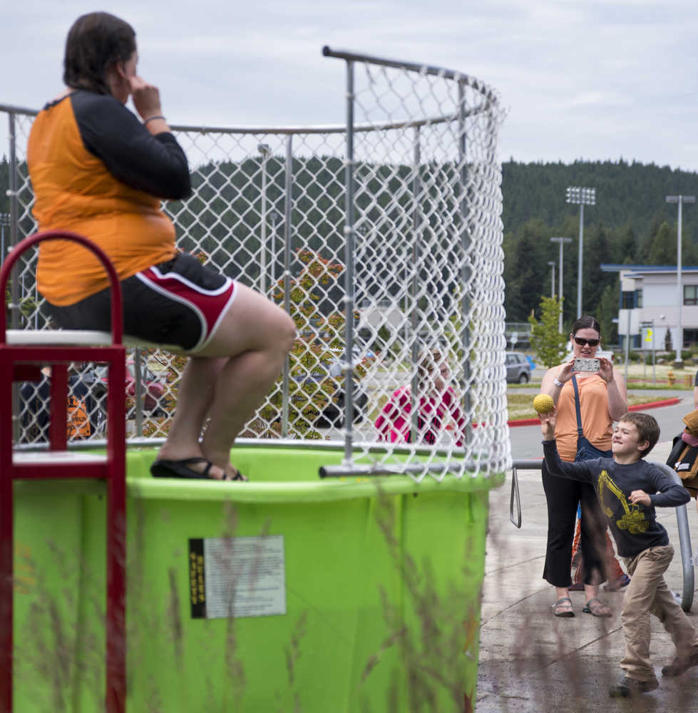 Torben Higgins, 7, right, throws a ball at the dunk tank lever as Julie Jackson, left, aquatics manager for the City and Borough of Juneau, awaits a dunk at the 6th Annual Rotary Day at the Pool at the Dimond Park Aquatic Center on Saturday afternoon. The pool held three free swims, with over 100 attendees at each swim.