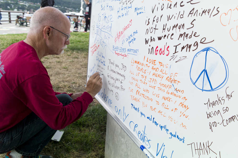 Michael Sleischhauer adds an anti-discrimination message to a white board during the Juneau Police Department's event for those that want to "be counted as a person against violence, against discrimination, and against hate" at Marine Park on Wednesday.