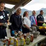 Lt. David Campbell, left, Deputy Chief of Police Ed Mercer, Community Service Officer Sarah Dolan, Mayor Ken Koelsch and Officer Ken Colon serve hot dogs during the Juneau Police Department event for those that want to "be counted as a person against violence, against discrimination, and against hate" at Marine Park on Wednesday.